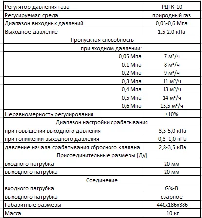 - Технологическое оборудование в соответствии с типовой схемой состоит из крана шарового ДУ-20 на входе, регулятора давления газа (EKB-10, FE-10, RF-10), крана шарового ДУ-32 на выходе. Для контроля давления на входе предусмотрен манометр с краном ДУ-15. Для контроля давления газа на выходе предусмотрен кран шаровой ДУ-15 с ниппелем для подсоединения мановакуумметра.