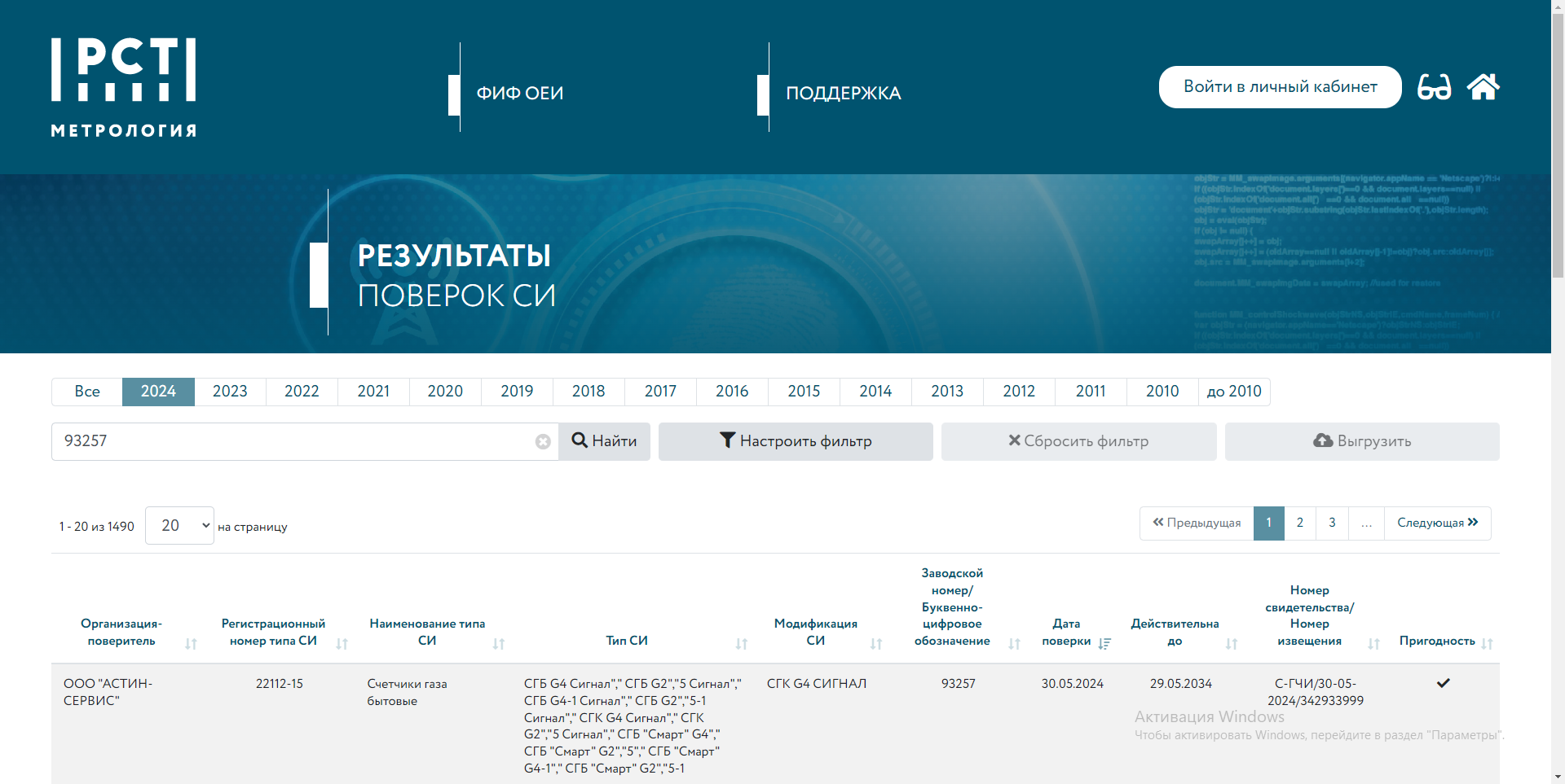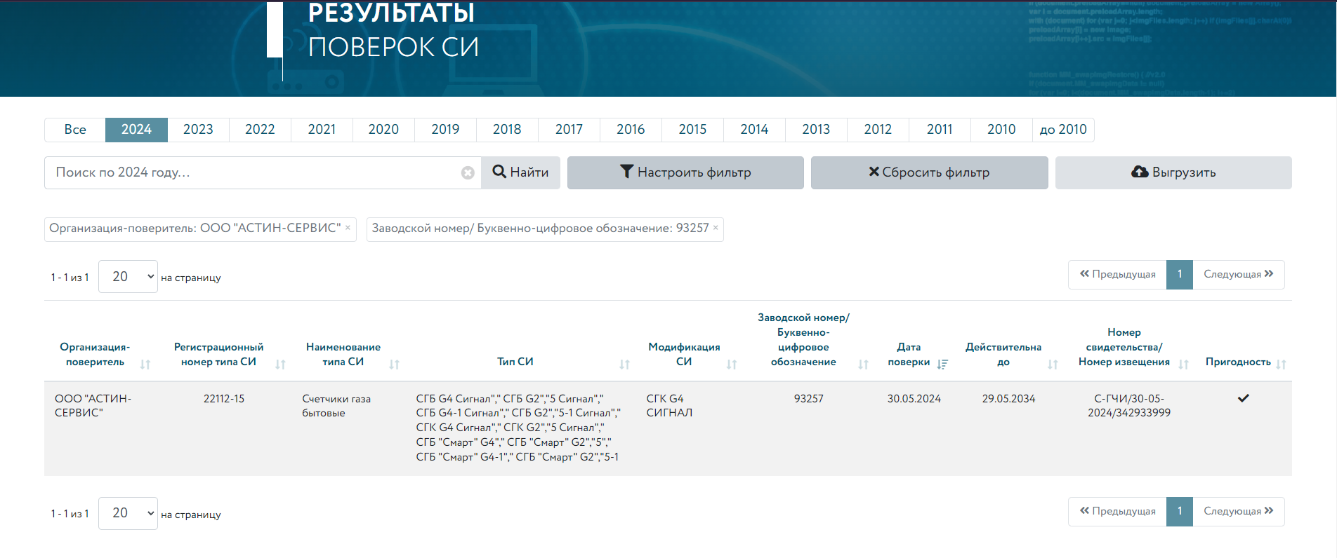 4. После выполнения поиска в реестре система выдаст результаты поверки:
