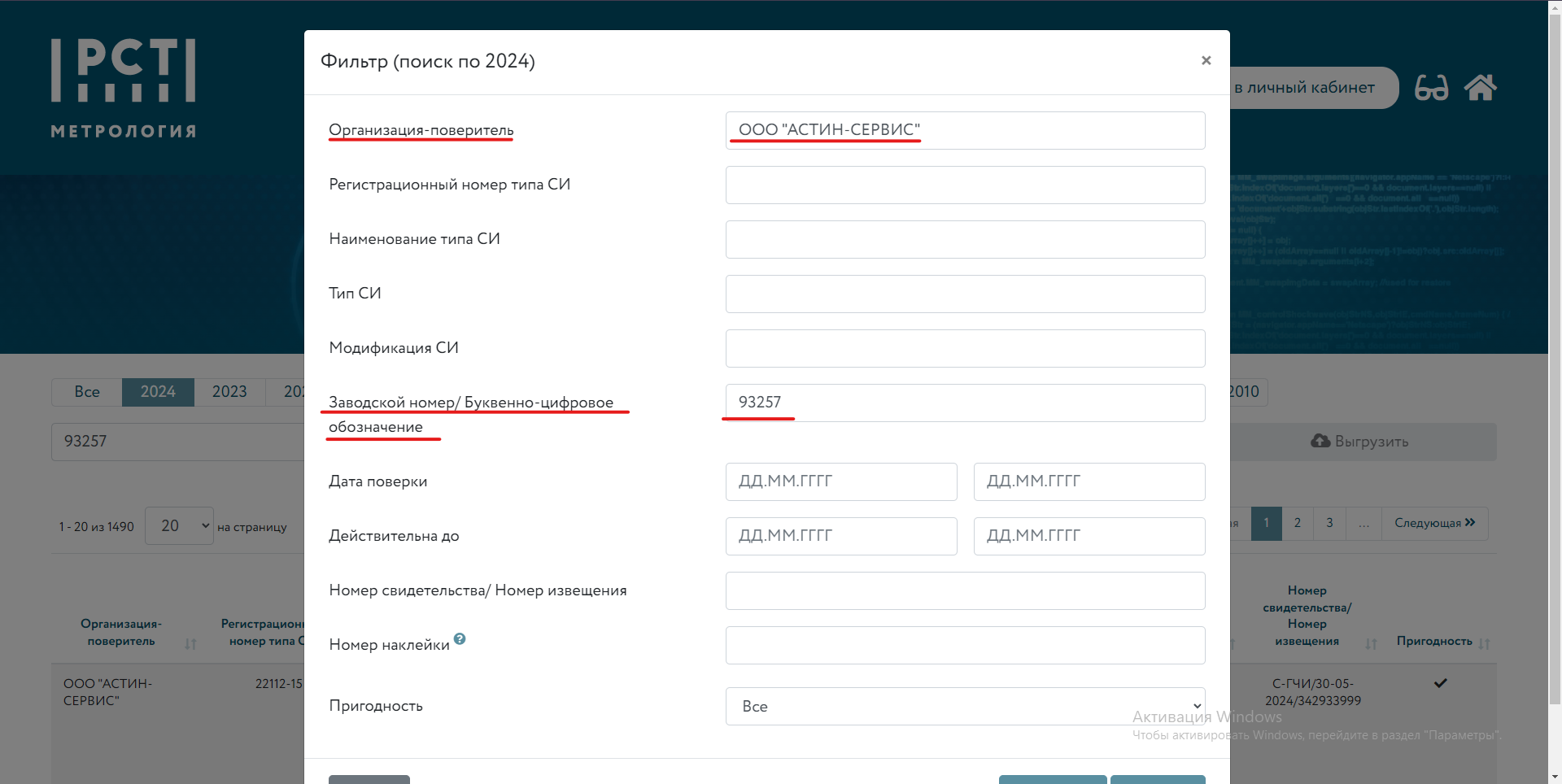 3. Выберете год поверки, нажать на кнопку "Настроить фильтр" и ввести в строке "Организация-поверитель" ООО "АСТИН-СЕРВИС",
